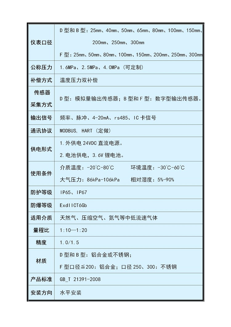 D型/ B型適合計(jì)量天然氣、氮?dú)狻?氫氣、壓縮空氣等潔凈的中低流速氣體。F型適合貿(mào)易計(jì)量天然氣、氮?dú)?、氫氣、壓縮空氣等潔凈 的中低流速氣體