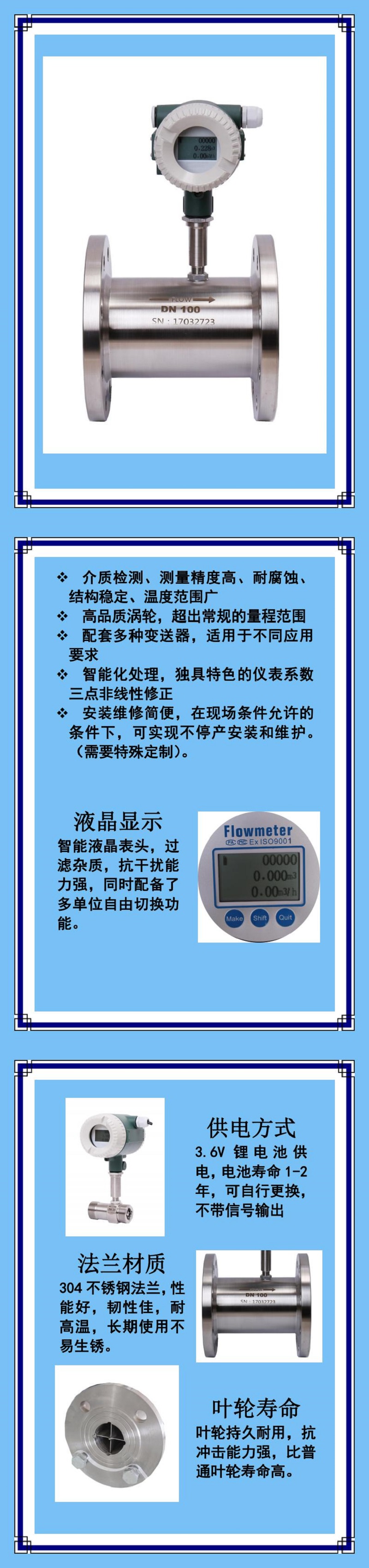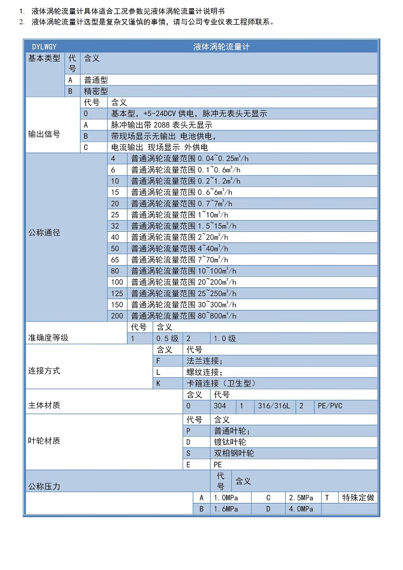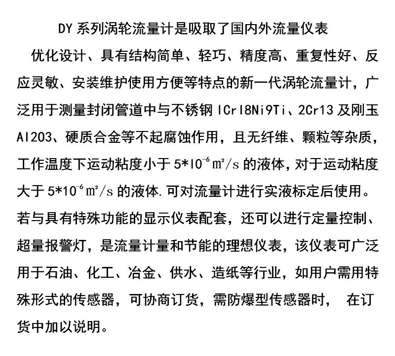 DY系列渦輪流量計(jì)是吸取了國內(nèi)外流量儀表優(yōu)化設(shè)計(jì)、具有結(jié)構(gòu)簡單、輕巧、精度高、重復(fù)性好、反應(yīng)靈敏、安裝維護(hù)使用方便等特點(diǎn)的新一代渦輪流量計(jì),可廣泛用于石油、化工、冶金、供水、造紙等行業(yè),如用戶需用特殊形式的傳感器,可協(xié)商訂貨,需防爆型傳感器時,在訂貨中加以說明。